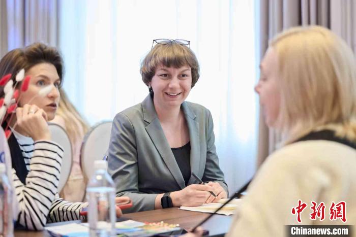 2025年3月,安娜斯塔西婭(左二)在莫斯科參加海南文旅推廣活動,與當(dāng)?shù)芈眯猩探涣鳌?受訪者 供圖)