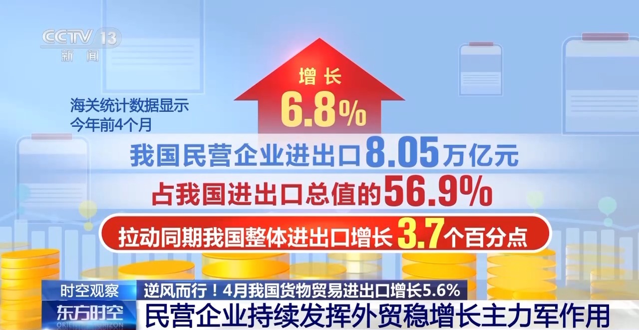 海關(guān)總署統(tǒng)計(jì)分析司司長 呂大良:今年以來,各項(xiàng)促進(jìn)民營經(jīng)濟(jì)發(fā)展的政策措施協(xié)同發(fā)力,參與外貿(mào)的民營企業(yè)數(shù)量穩(wěn)定增加。前4個月,有進(jìn)出口實(shí)績的民營企業(yè)達(dá)49.2萬家,增加8.2%,占我國有進(jìn)出口實(shí)際企業(yè)數(shù)量的86.5%。