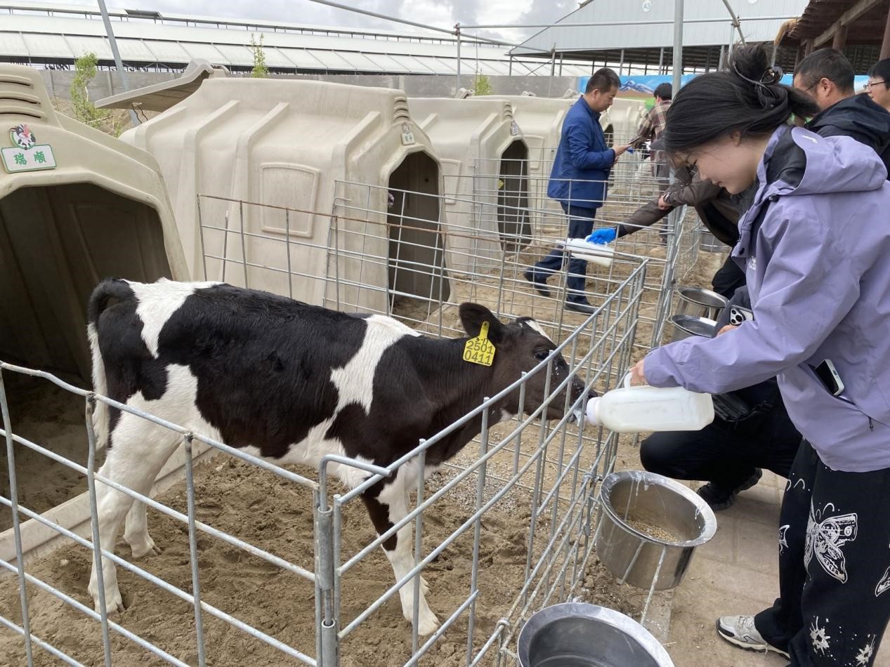 圖為天瑞祥牧場(chǎng)研學(xué)基地,游客在體驗(yàn)給小牛喂奶。冶明偉攝