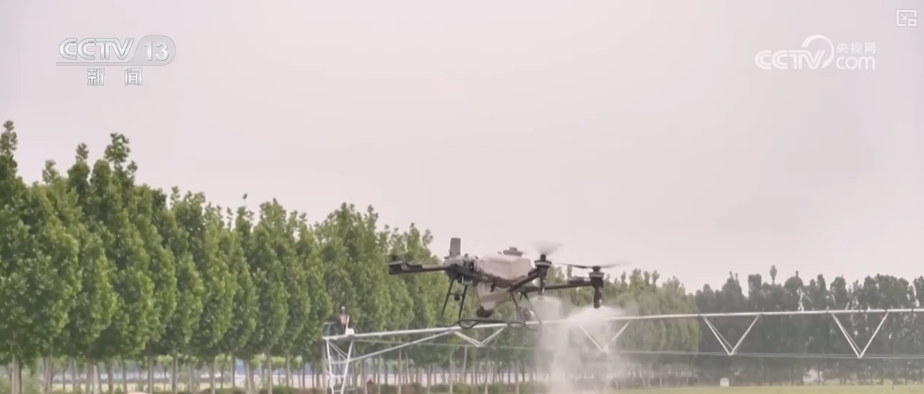根據(jù)物聯(lián)網(wǎng)蟲(chóng)情監(jiān)測(cè)系統(tǒng)提供的信息,植保無(wú)人機(jī)在麥田上精準(zhǔn)噴灑混合液。