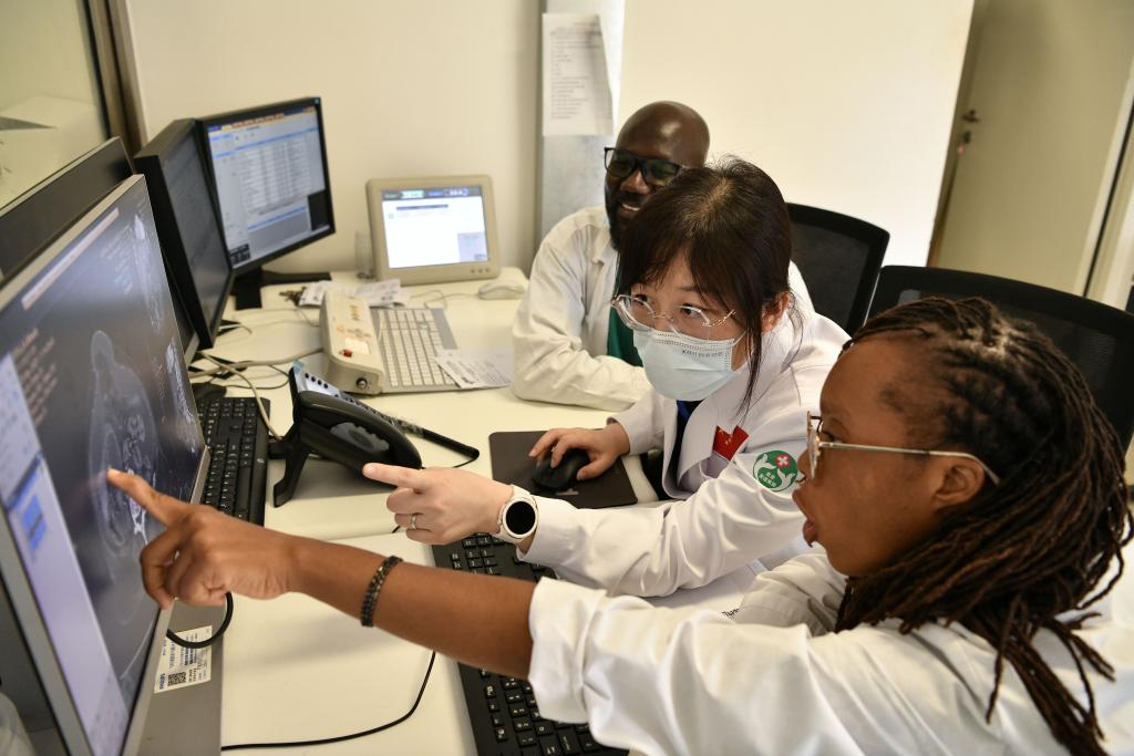 清晨的幾內(nèi)亞首都科納克里,陽光穿透中幾友好醫(yī)院新啟用的醫(yī)療綜合樓玻璃幕墻,灑在走廊上。來自中國的放射科醫(yī)生劉朋與幾方主任阿梅莉·拉馬正俯身在一臺(tái)1.5T磁共振儀器前,仔細(xì)分析一名患者的脊柱影像。兩人時(shí)而比劃手勢(shì),時(shí)而切換中法雙語交流,最終在診斷報(bào)告上簽下共同意見。