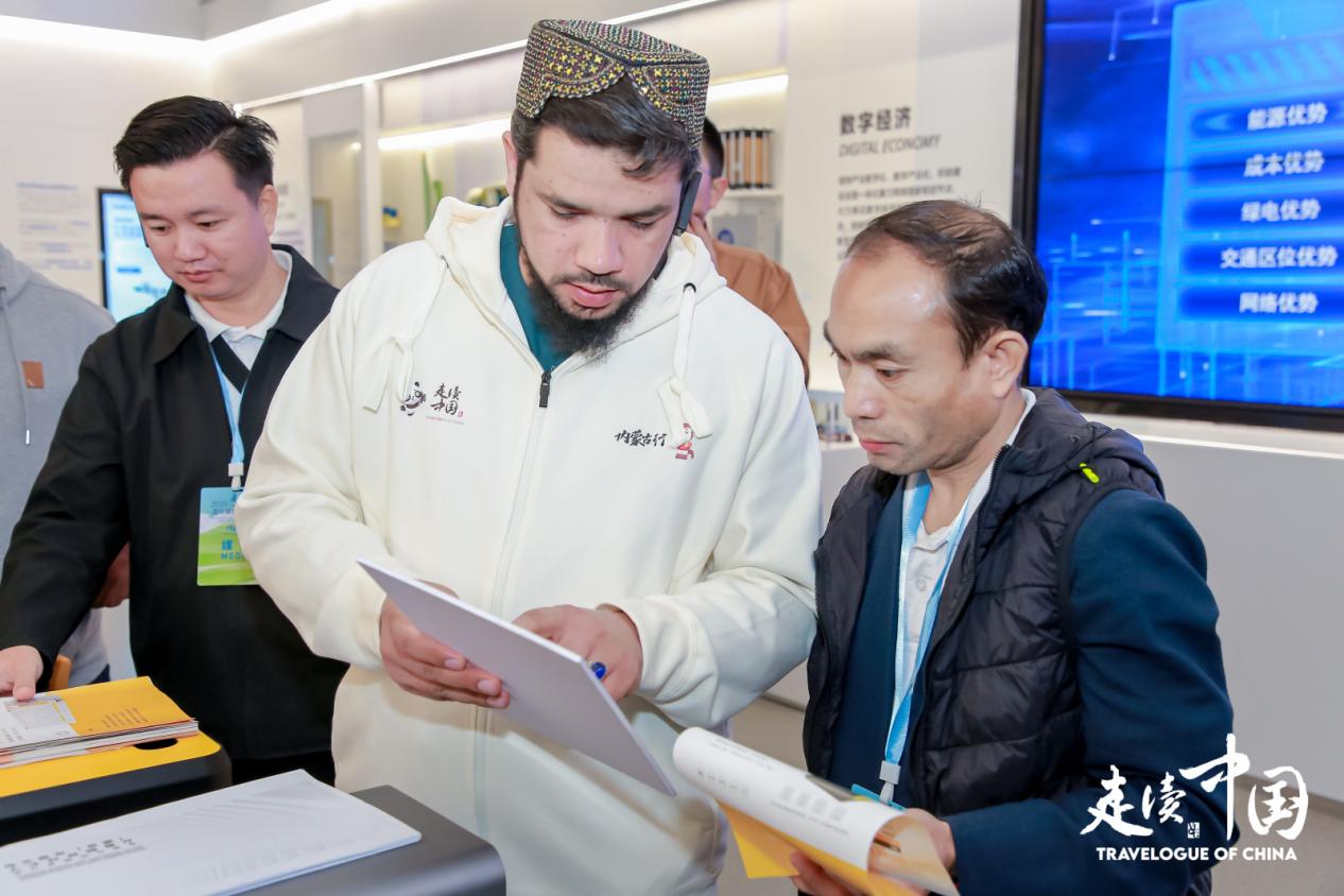 《喀布爾時(shí)報(bào)》總編尼克馬爾(中)在烏蘭察布(京蒙)人才科創(chuàng)園展廳仔細(xì)了解相關(guān)介紹