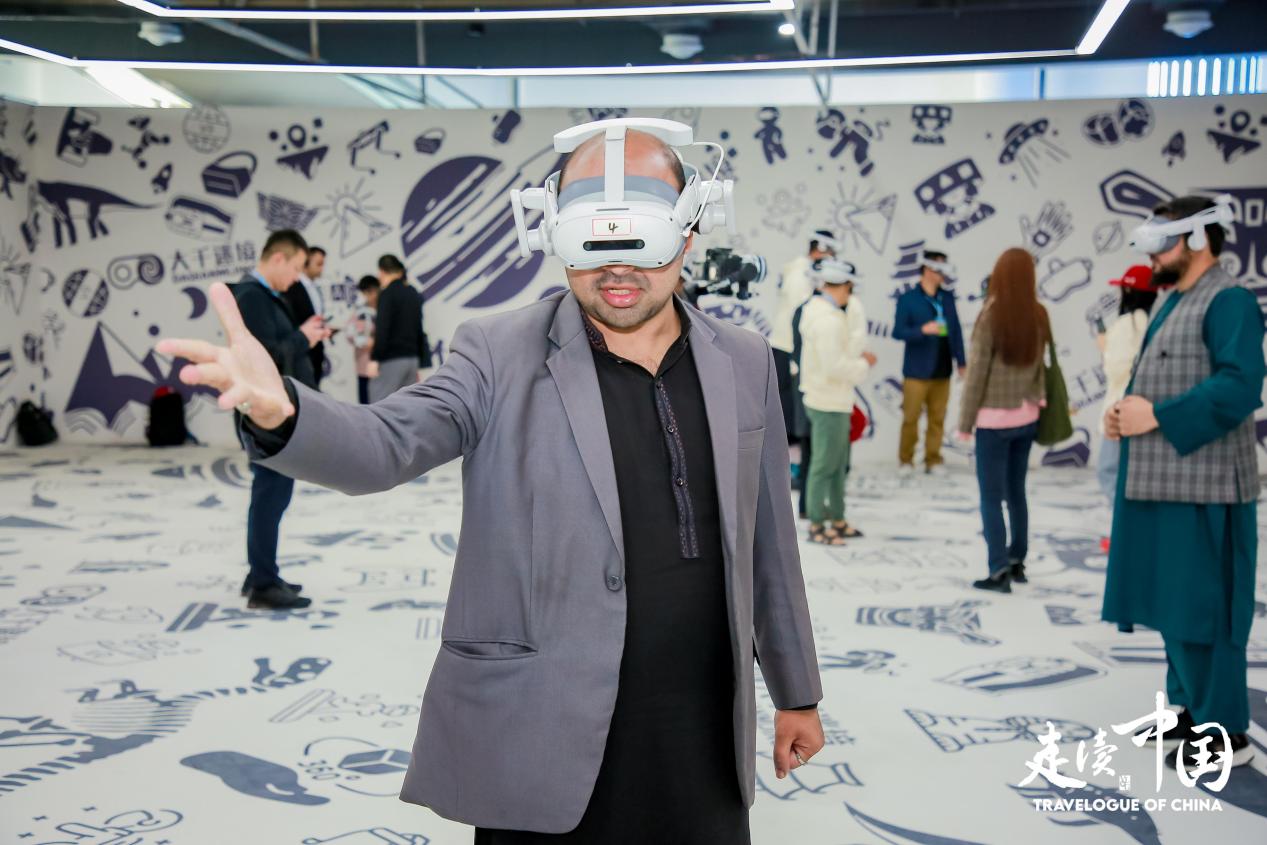 巴基斯坦記者賽義德·奧恩·穆罕默德佩戴VR設(shè)備體驗(yàn)互動(dòng)場(chǎng)景