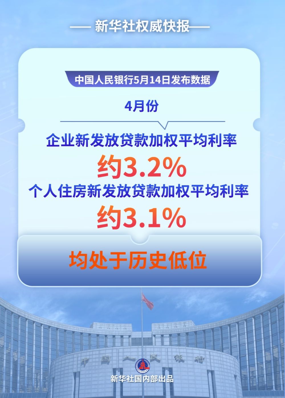 中國人民銀行的數(shù)據(jù)顯示,4月份,企業(yè)新發(fā)放貸款加權(quán)平均利率約3.2%,比上年同期低約50個基點;個人住房新發(fā)放貸款加權(quán)平均利率約3.1%,比上年同期低約55個基點,均處于歷史低位。