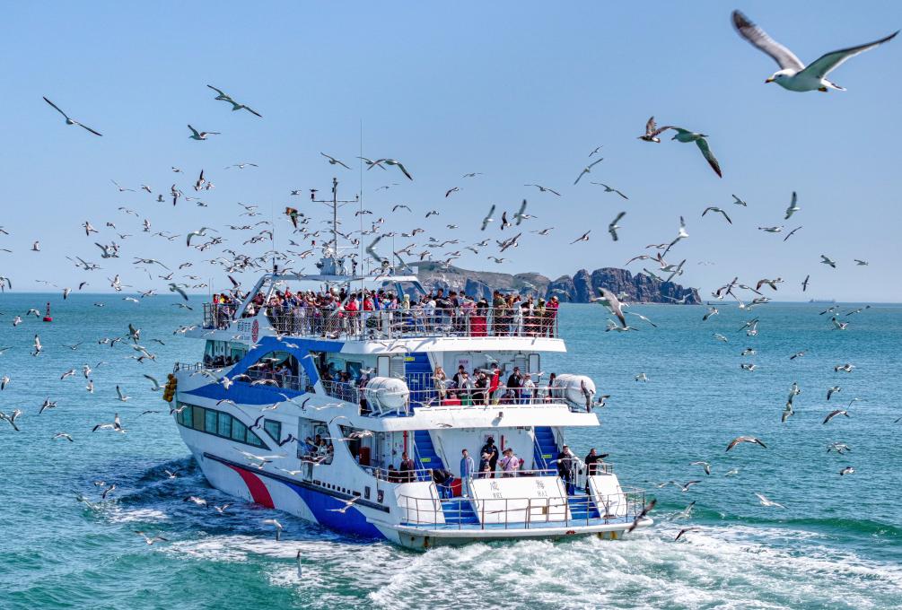 5月4日,在山東省榮成市海驢島海域,游客乘坐海驢島環(huán)島游專線與黑尾鷗互動(無人機(jī)照片)。新華社發(fā)(李信君 攝)