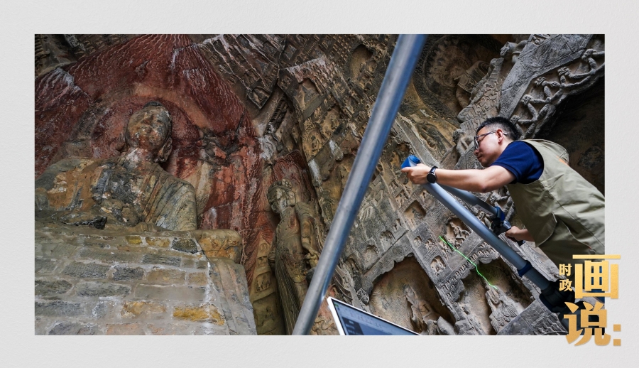 工作人員在對(duì)石刻病害情況進(jìn)行詳細(xì)記錄