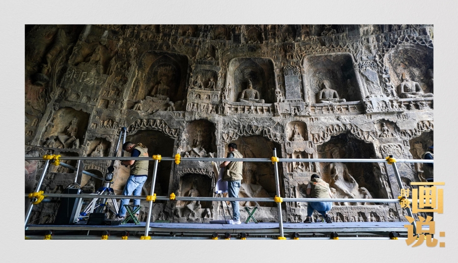 龍門石窟研究院工作人員在古陽洞使用關(guān)節(jié)臂掃描儀對(duì)佛像進(jìn)行數(shù)字化掃描