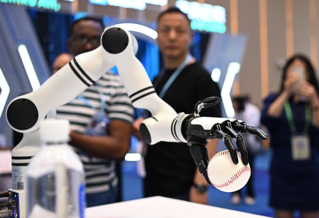 2025年4月15日,在第137屆廣交會服務(wù)機(jī)器人專區(qū),機(jī)械臂展示靈巧手功能。新華社記者 鄧華 攝