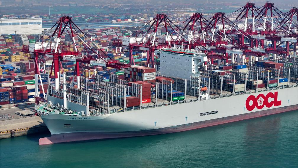 4月10日,一艘集裝箱貨輪在山東港口青島港前灣集裝箱碼頭進(jìn)行裝卸作業(yè)(無人機(jī)照片)。新華社記者 李紫恒 攝