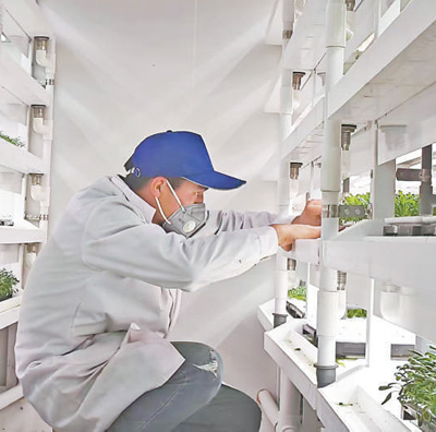 庫車市甬庫同心村智慧農(nóng)業(yè)植物工廠育苗室內,工作人員在仔細觀察幼苗。 王紅麗攝