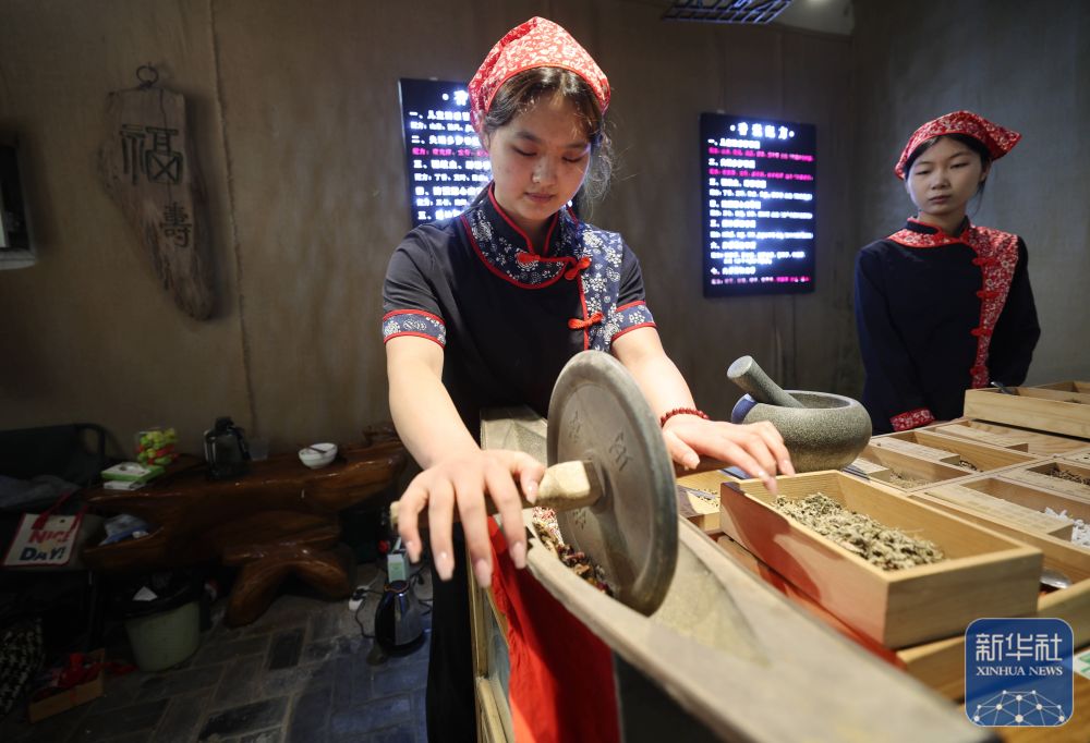 5月24日,在山東省臨沂市沂南縣銅井鎮(zhèn)竹泉村,傳統(tǒng)手工藝人在搗碎中藥材,準備制作香囊。新華社發(fā)(王彥冰攝)
