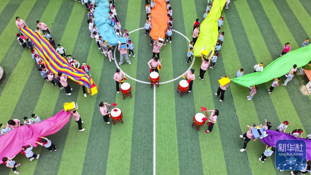 5月23日,在山東省東營市廣饒縣李鵲鎮(zhèn)中心幼兒園,小朋友在進行龍舟賽游戲(無人機照片)。新華社發(fā)(劉云杰攝)
