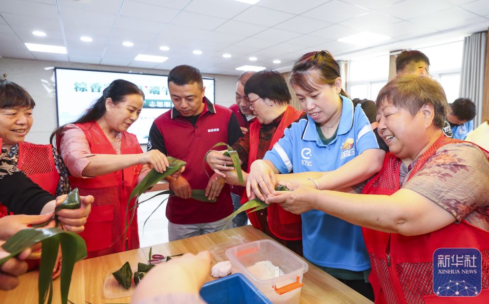 5月23日,江蘇省淮安經(jīng)濟技術開發(fā)區(qū)的退休職工志愿者和快遞員一起包粽子。新華社發(fā)(趙啟瑞攝)