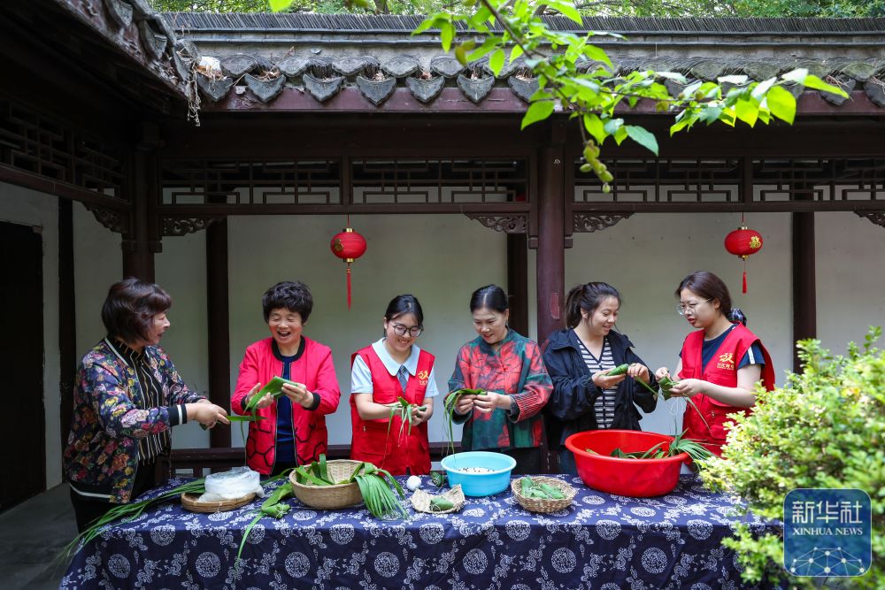 5月24日,在位于江蘇省興化市昭陽街道的興化書院,青年志愿者和社區(qū)居民一起包粽子。新華社發(fā)(周社根攝)