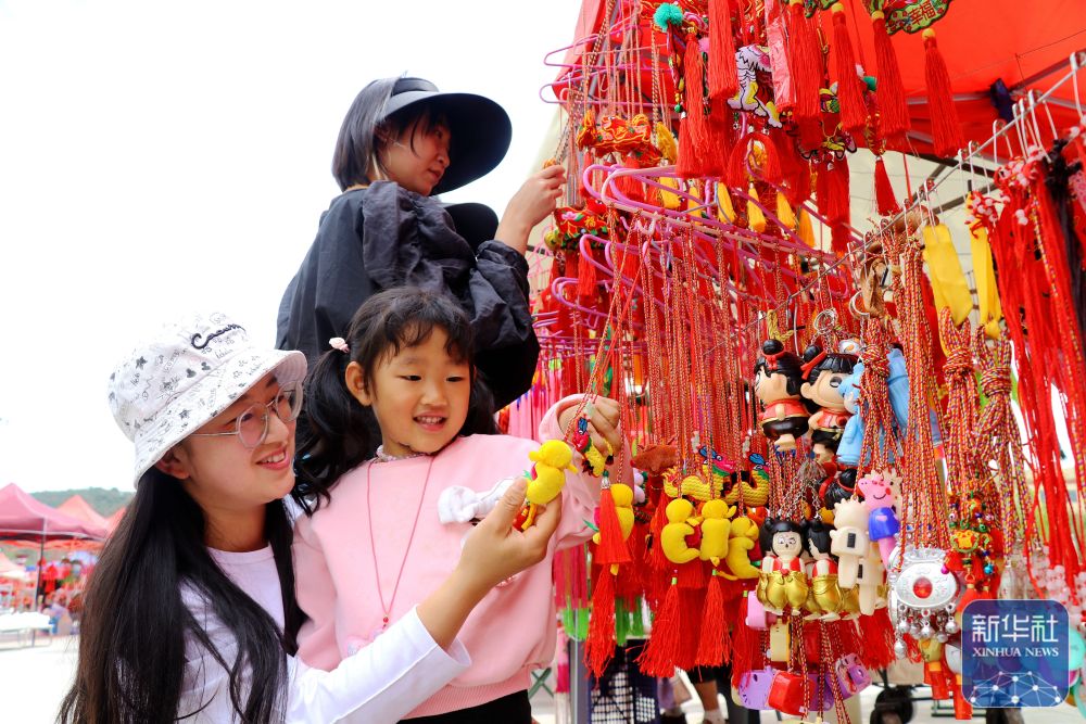 5月24日,在甘肅省平?jīng)鍪徐o寧縣成紀文化城廣場,人們在選購香荷包。新華社發(fā)(王毅攝)