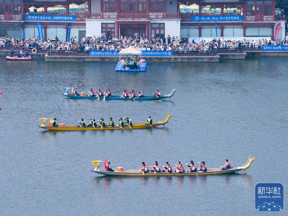 5月24日,龍舟隊在江蘇省南京市莫愁湖公園參加比賽(無人機照片)。新華社發(fā)(楊素平攝)