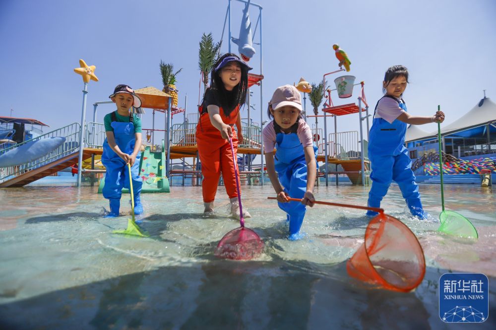 5月24日,游客在河北省遵化市南山常樂谷景區(qū)水世界參加親子撈魚活動。新華社發(fā)(劉滿倉攝)