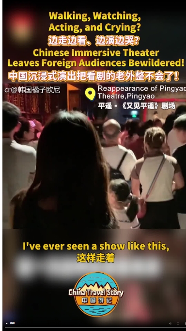 在西安《駝鈴傳奇》中,親歷“狼群”環(huán)伺的震撼冒險;走進《又見平遙》,踩著青磚“卷入”晉商江湖;去鄭州“只有河南·戲劇幻城”,回到“教室”重拾青春記憶……“感覺到電影里面啦”“太壯觀了”,觀看這些中國沉浸式演出的老外們上一秒還在咧嘴大笑,下一秒就哭成了淚人。