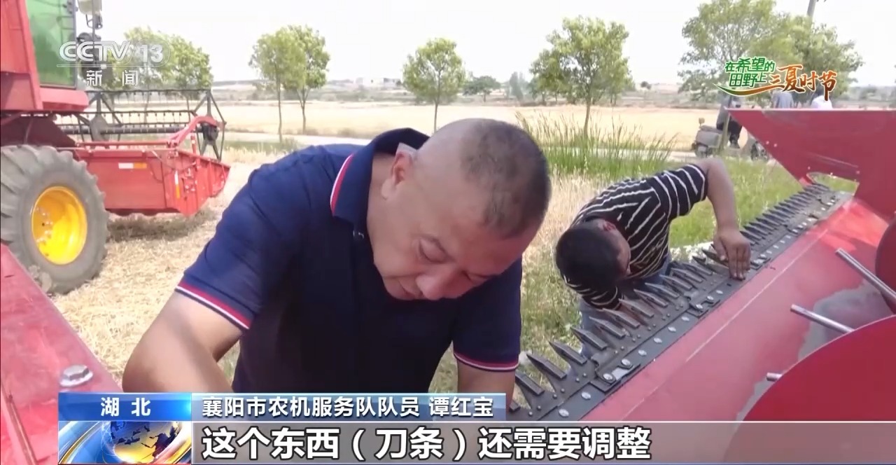 農(nóng)機維修也是夏收中非常重要的一個環(huán)節(jié)。在湖北省襄陽市襄州區(qū)黃龍鎮(zhèn)潘明村的1000畝大田里,6臺收割機正趕在雨前搶收。突然,一臺收割機出現(xiàn)故障止步不前,機手撥打維修電話20分鐘后,農(nóng)機服務(wù)車趕到了麥田旁。經(jīng)過檢修發(fā)現(xiàn),這臺收割機刀條發(fā)生了斷裂。