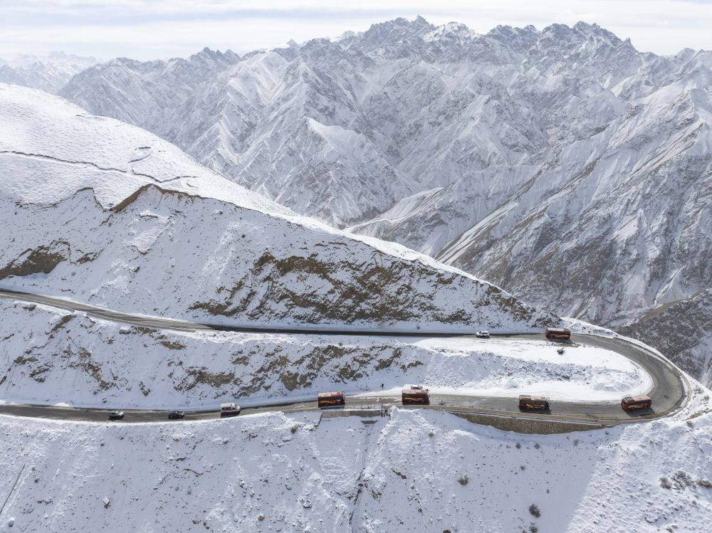 在新疆塔什庫爾干塔吉克自治縣,參加“盤龍古道”恢復(fù)通車儀式的車隊在行進中(2025年3月22日攝)。新華社記者 徐宏巖 攝