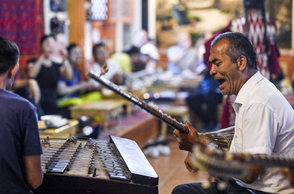 樂手在新疆喀什古城百年老茶館內(nèi)彈唱(2023年9月15日攝)。新華社記者 王菲 攝