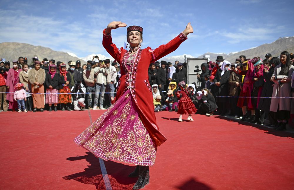 在新疆塔什庫爾干塔吉克自治縣提孜那甫鄉(xiāng)賽馬場,參與非遺展演的村民在跳舞(2025年3月23日攝)。新華社記者 胡虎虎 攝