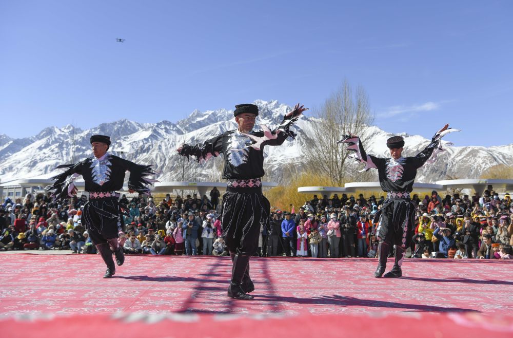 在新疆塔什庫爾干塔吉克自治縣“彩云人家”民俗村,演員為觀眾表演國家級非物質(zhì)文化遺產(chǎn)——鷹舞(2025年3月22日攝)。新華社記者 胡虎虎 攝