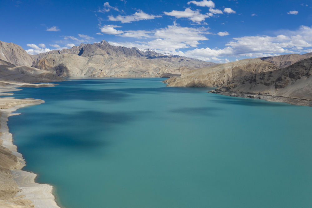 位于新疆塔什庫爾干塔吉克自治縣的“班迪爾藍湖”一角(2023年8月28日攝,無人機照片)。新華社記者 胡虎虎 攝