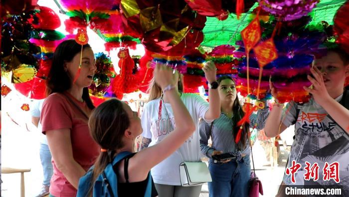 山腳下熱鬧的端午市集格外引人注目,琳瑯滿目的五彩繩、香包和手工飾品讓俄羅斯游客流連忘返,大家紛紛試戴購買,感受著濃厚的節(jié)日氛圍。