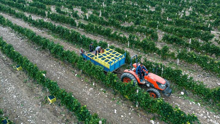工人在寧夏沃爾豐釀酒葡萄種植基地轉運采摘下的釀酒葡萄(2024年9月19日攝,無人機照片)。
