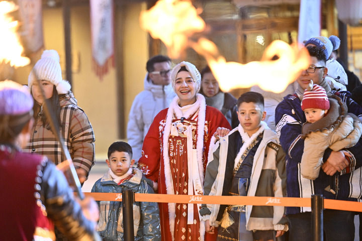 外國友人在“漫葡·看見賀蘭”沉浸式演藝小鎮(zhèn)內觀看演出(2025年1月14日攝)。