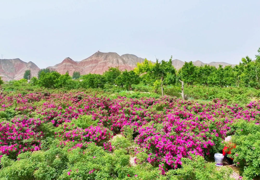 每年春末夏初,大片大片的玫瑰花,一團(tuán)團(tuán)一簇簇,盛開得像一幅油畫,鋪陳在苦水鎮(zhèn)干枯的溝梁間。整個(gè)小鎮(zhèn)沐浴著花香,寫意又嫵媚,盡情展示大西北一年之中最動人最美麗的時(shí)刻。