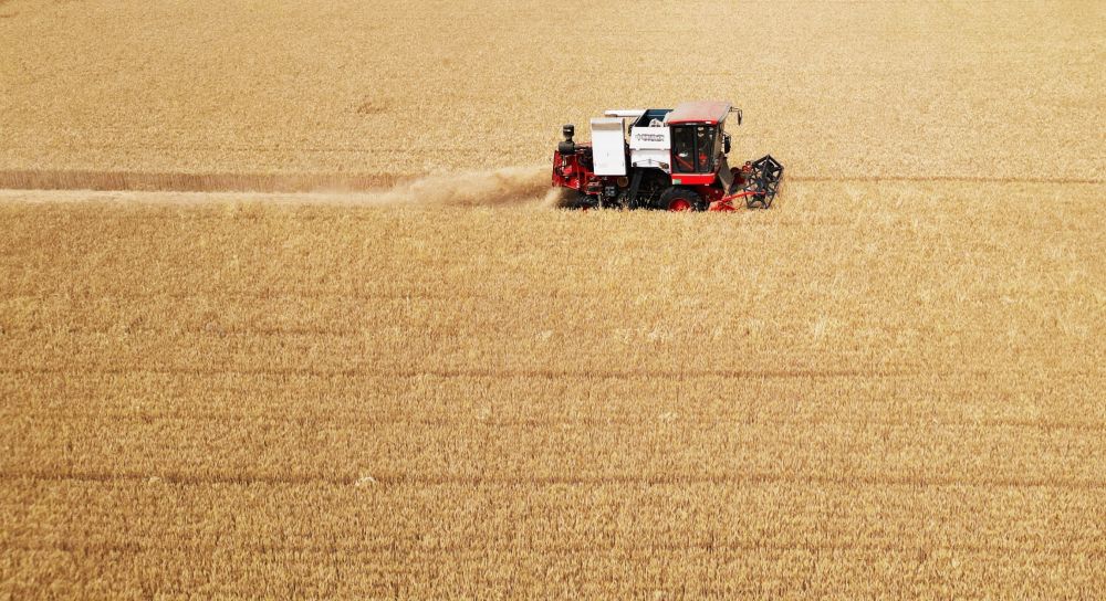 麥田金黃,農(nóng)機(jī)手收割正酣,一排排小麥被整齊地切割、脫?!瓘V袤農(nóng)田一片繁忙景象。