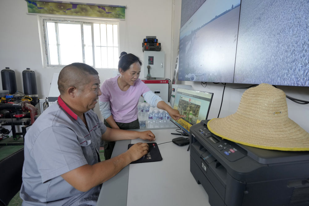 在山西省運城市鹽湖區(qū)解州鎮(zhèn)曲村,董會龍(左)和妻子范月親通過農(nóng)機(jī)精準(zhǔn)作業(yè)平臺查看農(nóng)機(jī)手作業(yè)情況。董會龍夫妻是運城市鹽湖區(qū)解州鎮(zhèn)的種糧大戶。(5月27日攝)。