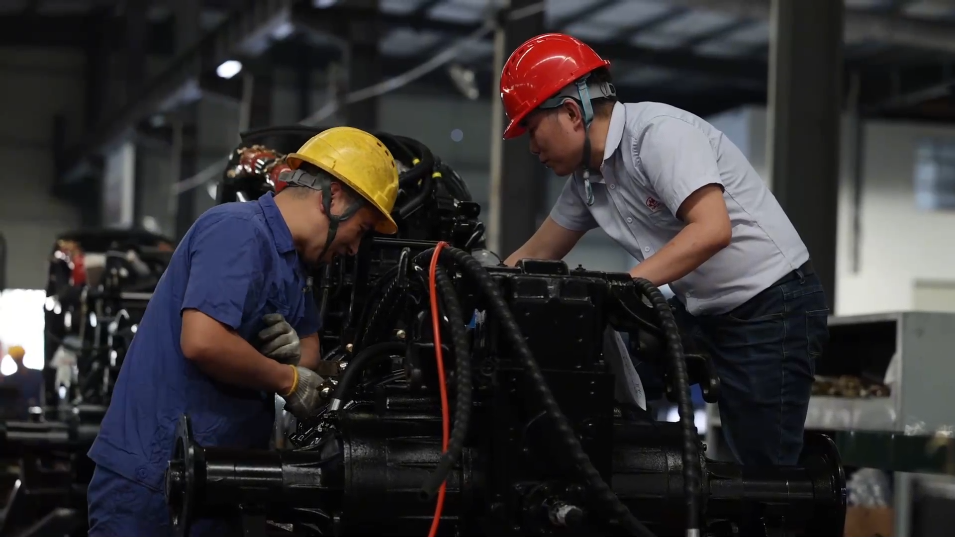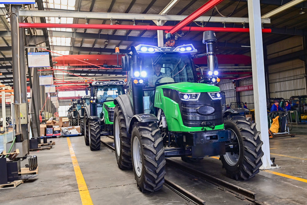 5月15日,在山東省青州經(jīng)濟開發(fā)區(qū)一家大型農(nóng)機制造企業(yè),工人調(diào)試檢驗出口海外的大馬力拖拉機。新華社發(fā)(王繼林 攝)