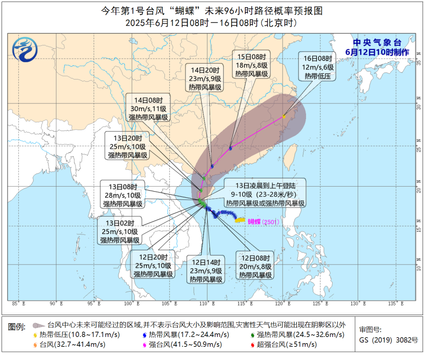 根據(jù)預(yù)報(bào)路徑,“蝴蝶”在海南島沿海首次登陸后,可能于14日白天在廣東西部到廣西沿海再次登陸,屆時(shí)強(qiáng)度仍將維持在強(qiáng)熱帶風(fēng)暴級(jí),登陸后轉(zhuǎn)向東北方向移動(dòng),強(qiáng)度逐漸減弱。