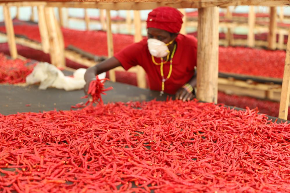 5月22日,工人在盧旺達(dá)東方省恩亞加塔雷地區(qū)篩選辣椒。新華社記者吉莉攝