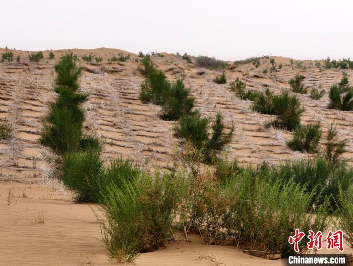 夏日驕陽炙烤著九棵樹治沙項(xiàng)目區(qū),廣袤的沙地上,一排排整齊的草方格如同給沙丘上了“鎖鏈”,而這些被固定住的流沙,為植被生長創(chuàng)造了重要條件。