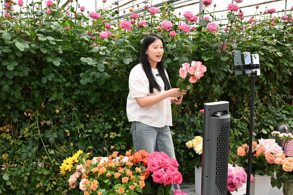 5月24日,在莒縣招賢鎮(zhèn)曲坊現(xiàn)代農(nóng)業(yè)產(chǎn)業(yè)園的玫瑰基地,工作人員通過網(wǎng)絡(luò)直播銷售鮮切玫瑰花。新華社記者 馬寧 攝