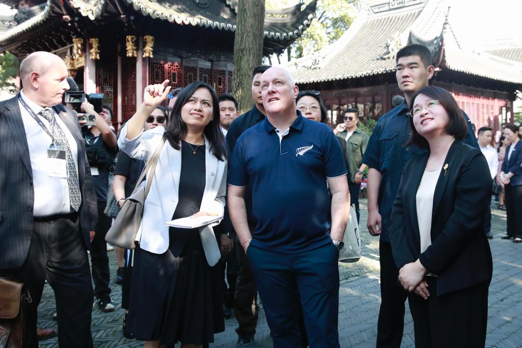 18日,正在上海訪問的新西蘭總理拉克森(前排中)赴豫園參訪。新華社記者高峰攝