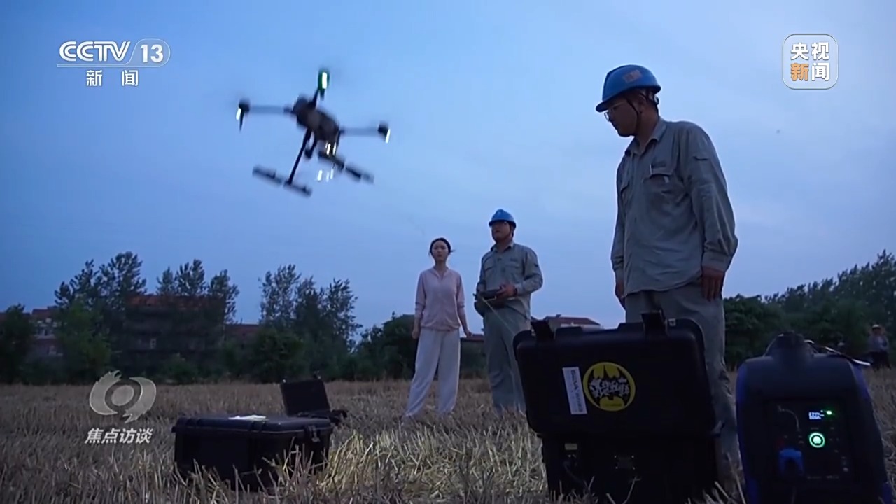 像放風(fēng)箏一樣,一個(gè)人從供電機(jī)牽線,另一個(gè)人控制無(wú)人機(jī)飛行,兩人打好配合,燈隨著車走。經(jīng)過(guò)五次磨合試飛,600瓦的燈光終于刺破夜空,照亮了兩畝麥田的區(qū)域。供電所技術(shù)人員的駐守,讓吳從先家的小麥在暴雨來(lái)臨前全部入倉(cāng)。