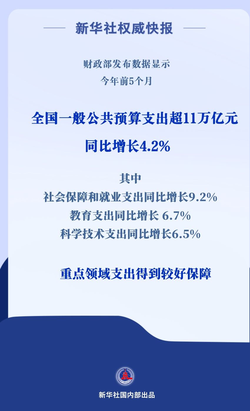 數(shù)據(jù)顯示,全國一般公共預算支出持續(xù)增長,前5個月達112953億元,同比增長4.2%。各級財政部門加大支出強度,優(yōu)化支出結(jié)構(gòu),持續(xù)加強對重點領(lǐng)域的支出保障。