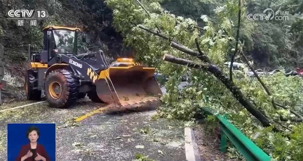 在邊坡垮塌現(xiàn)場,大量泥石和樹木橫倒在道路中間,當?shù)毓窊岆U人員迅速對此處路段實施交通管制,并利用機械開展清障工作。