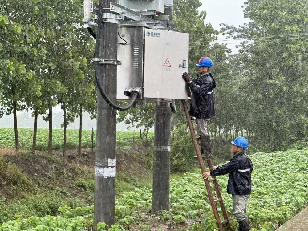 21日上午,暴雨如注,湖北荊州石首市大垸鎮(zhèn)北碾村的田野在雨幕中愈發(fā)朦朧?!坝陝葸€在加大,必須趕在積水漫過田埂前完成架線!”在北碾村東河頭八組,電工祁劍的呼喊聲穿透雨幕。