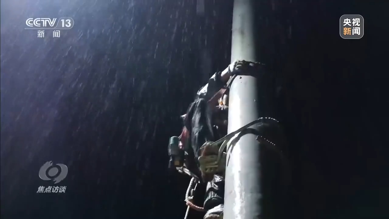 運(yùn)線、接線、試驗(yàn)……雨夜中,隊(duì)員們分工協(xié)作,借助車燈和探照燈的光亮,將一根1100米長(zhǎng)、近4噸重的電纜拉過(guò)大橋,沿著公路邊緣一路拉到變壓器旁。大雨中作業(yè),雨水很快就打濕了他們的衣服。為了搶修進(jìn)度,高空作業(yè)人員在電桿上一待就是好幾個(gè)小時(shí)。