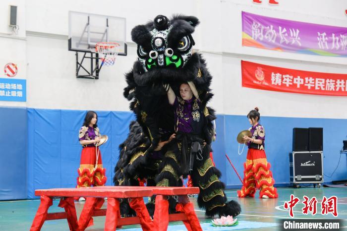 莎何娜斯(中間)表演舞獅。湖州師范學院供圖