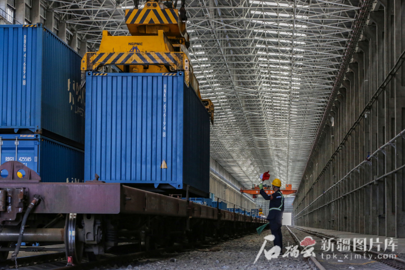 6月24日,工作人員在阿拉山口站中歐(中亞)班列換裝區(qū)指揮行車吊裝集裝箱。蔡增樂(lè) 攝