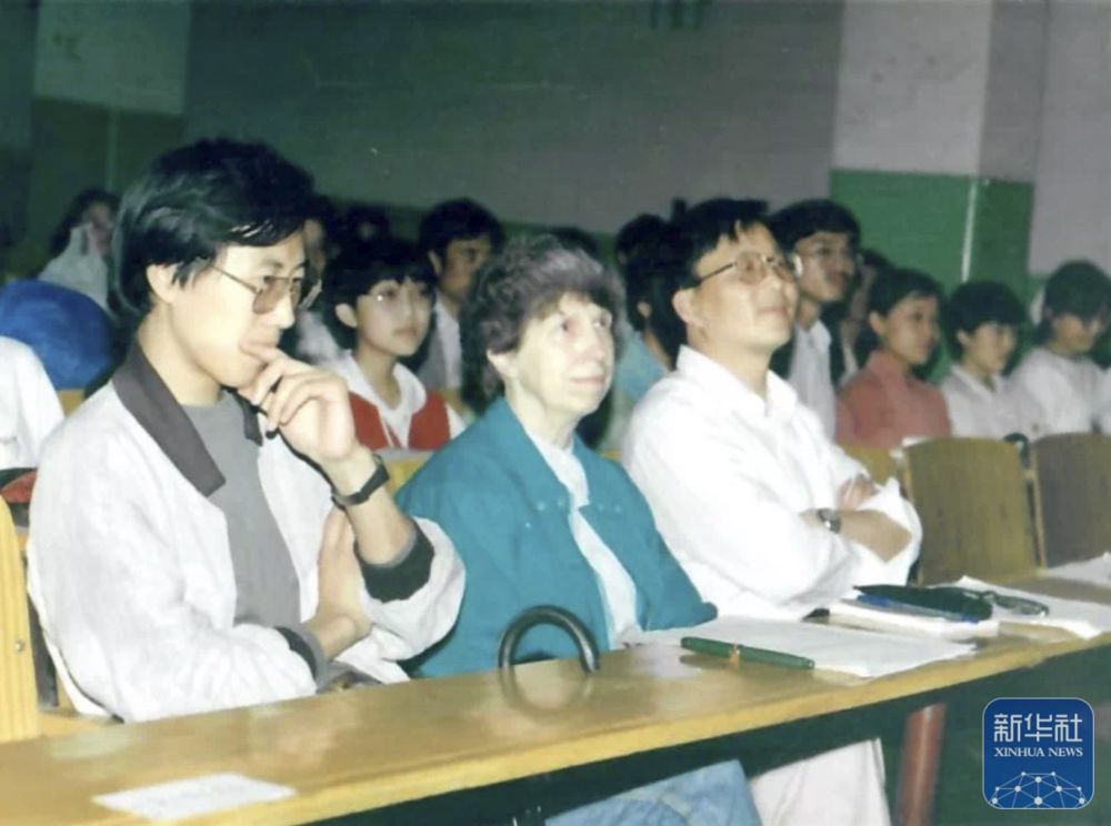 20世紀(jì)80年代,白麗詩(shī)(前中)在上海外國(guó)語(yǔ)大學(xué)任教時(shí)的工作照(翻拍照片)。
