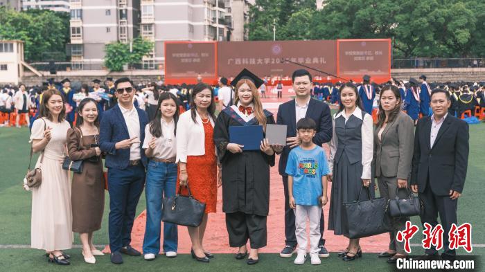 6月27日,留學生馬麗文在畢業(yè)典禮上與從老撾前來的親人合影留念。(受訪者供圖)