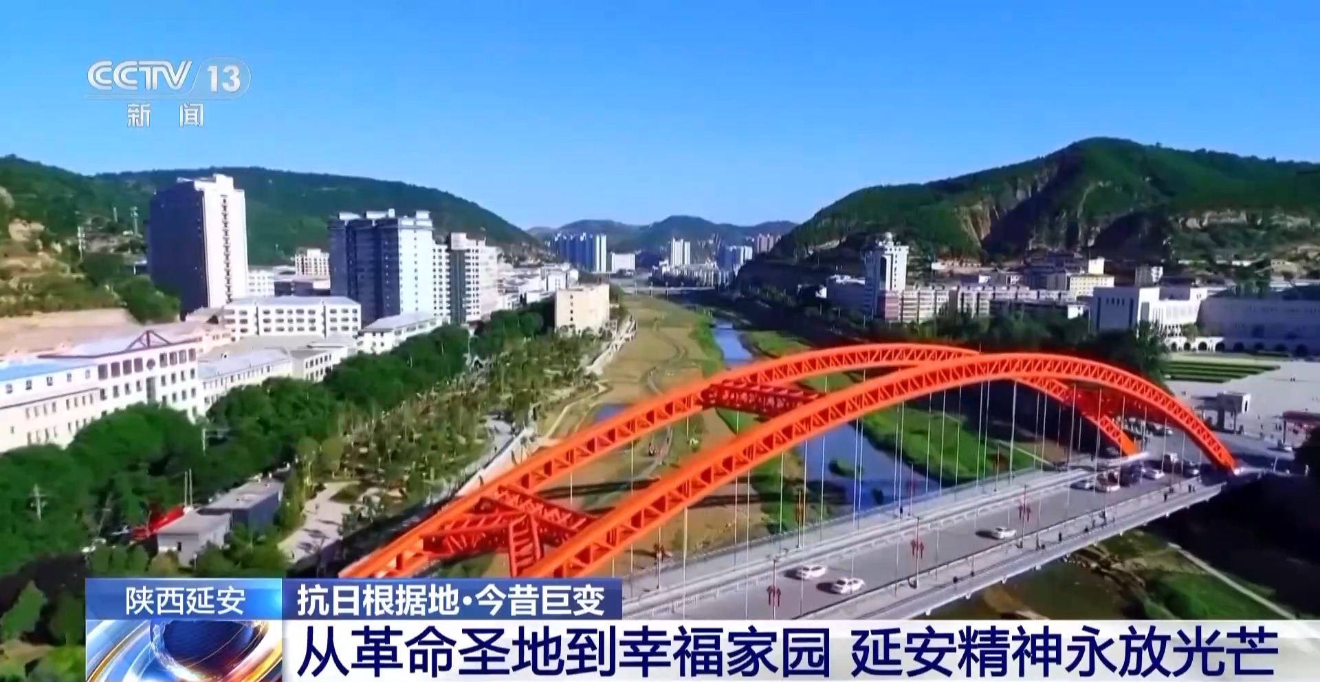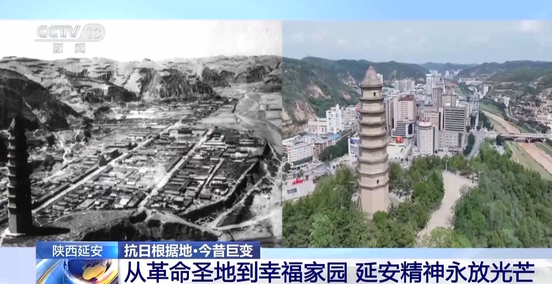 說到延安,很多人自然就會想到巍巍寶塔山,這張照片就是拍攝于80多年前的寶塔山上。當時,城里大多是低矮的平房。如今從同一個位置俯瞰,這里已經發(fā)生了翻天覆地的巨變——延河兩岸,高樓大廈拔地而起,鱗次櫛比的現(xiàn)代化新城矗立眼前。